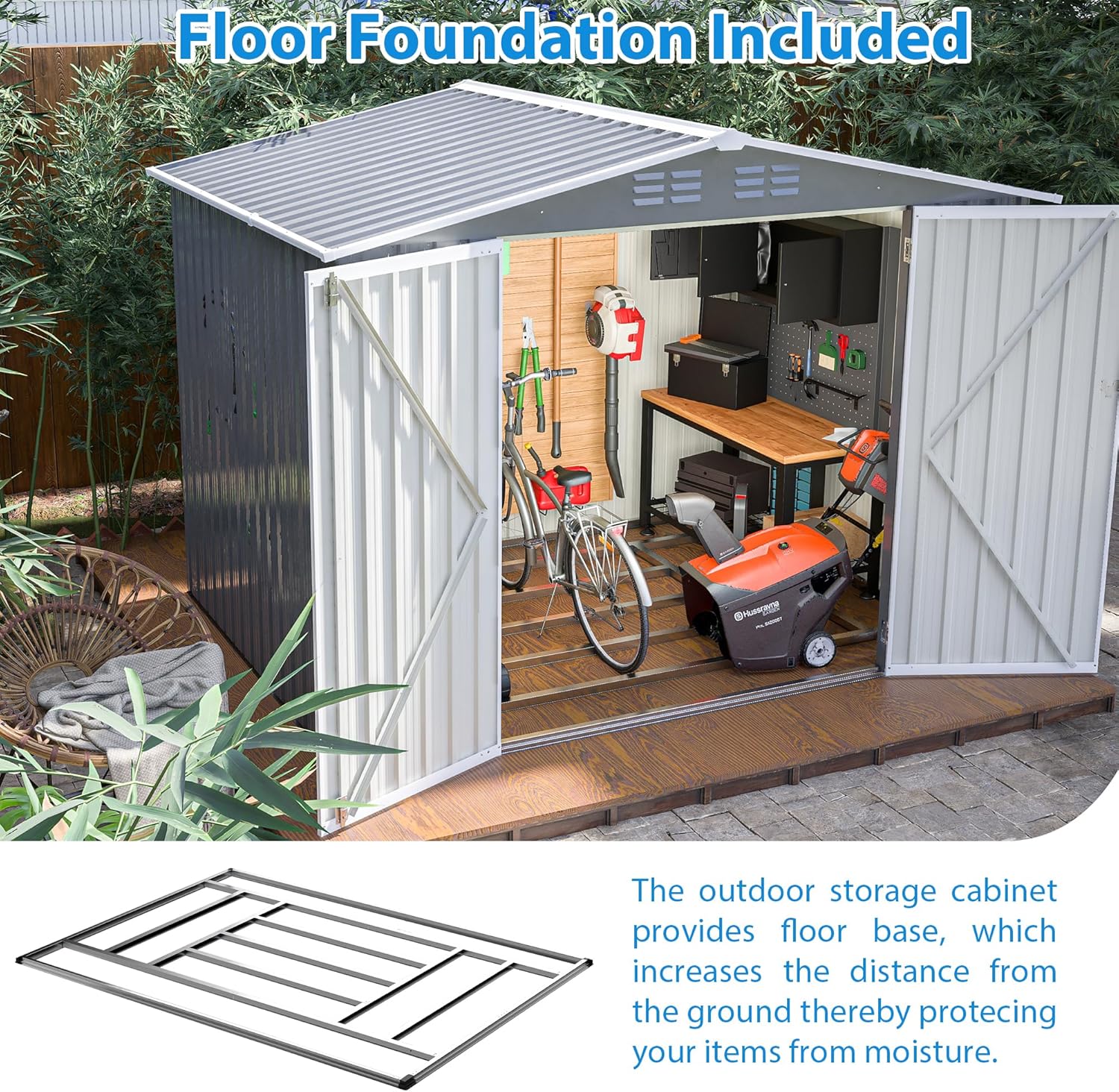 - 【Spacious Storage Space】This 8 X 6-Foot Metal Shed Provides Ample Storage Space And Can Easily Accommodate Snow Blowers, Shovels, Outdoor Furniture, Bicycles, Gardening Tools And Other Items, Making It An Ideal Choice For Your Yard Tidying Up.