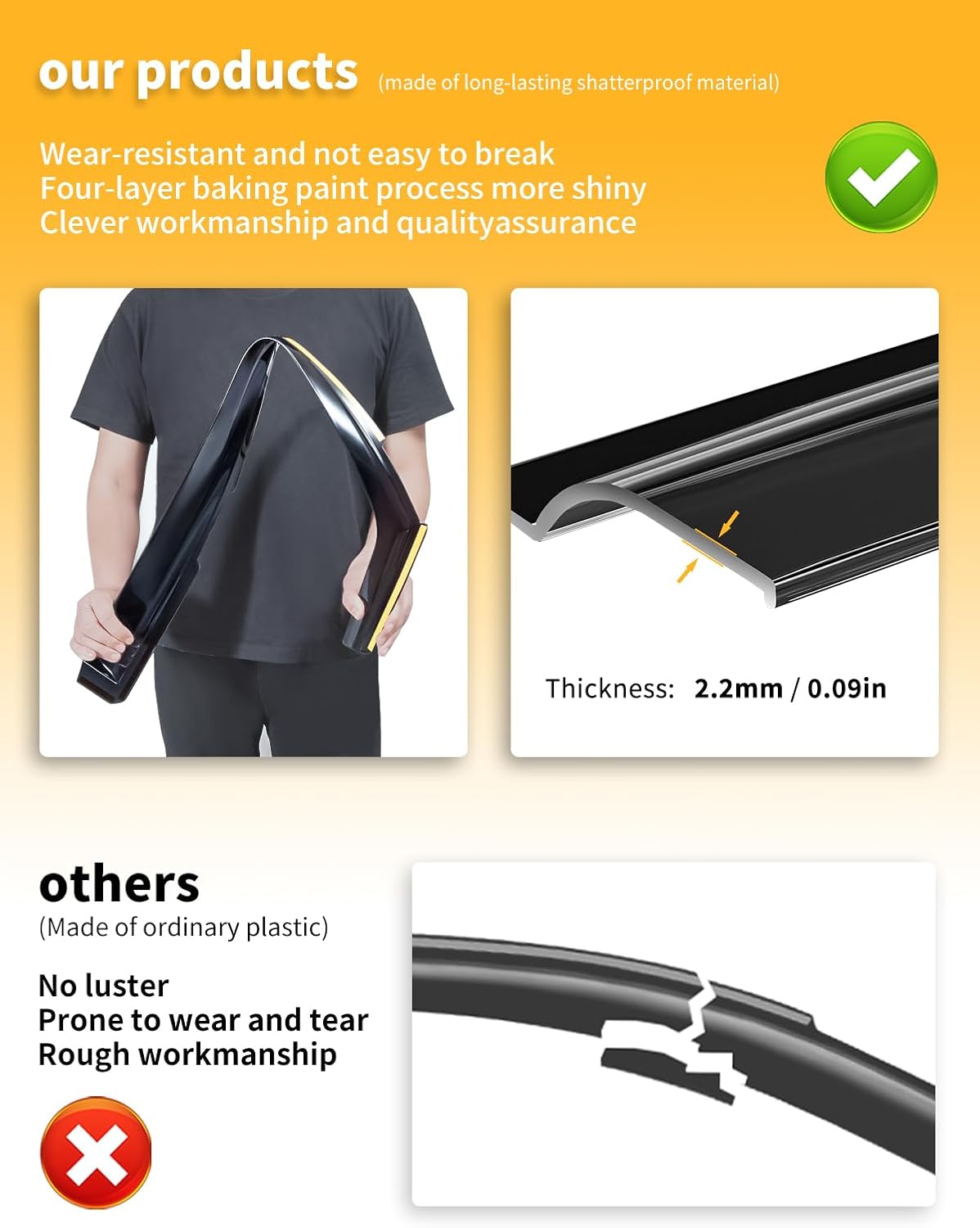 - 【EASY TO INSTALL】There is no drilling or no tools required. If there is a situation where the window cannot be raised due to jamming, please manually adjust the position of the rain guards and close the window for 72 hours to stabilize the position. Reduce the problem of unable to close windows.