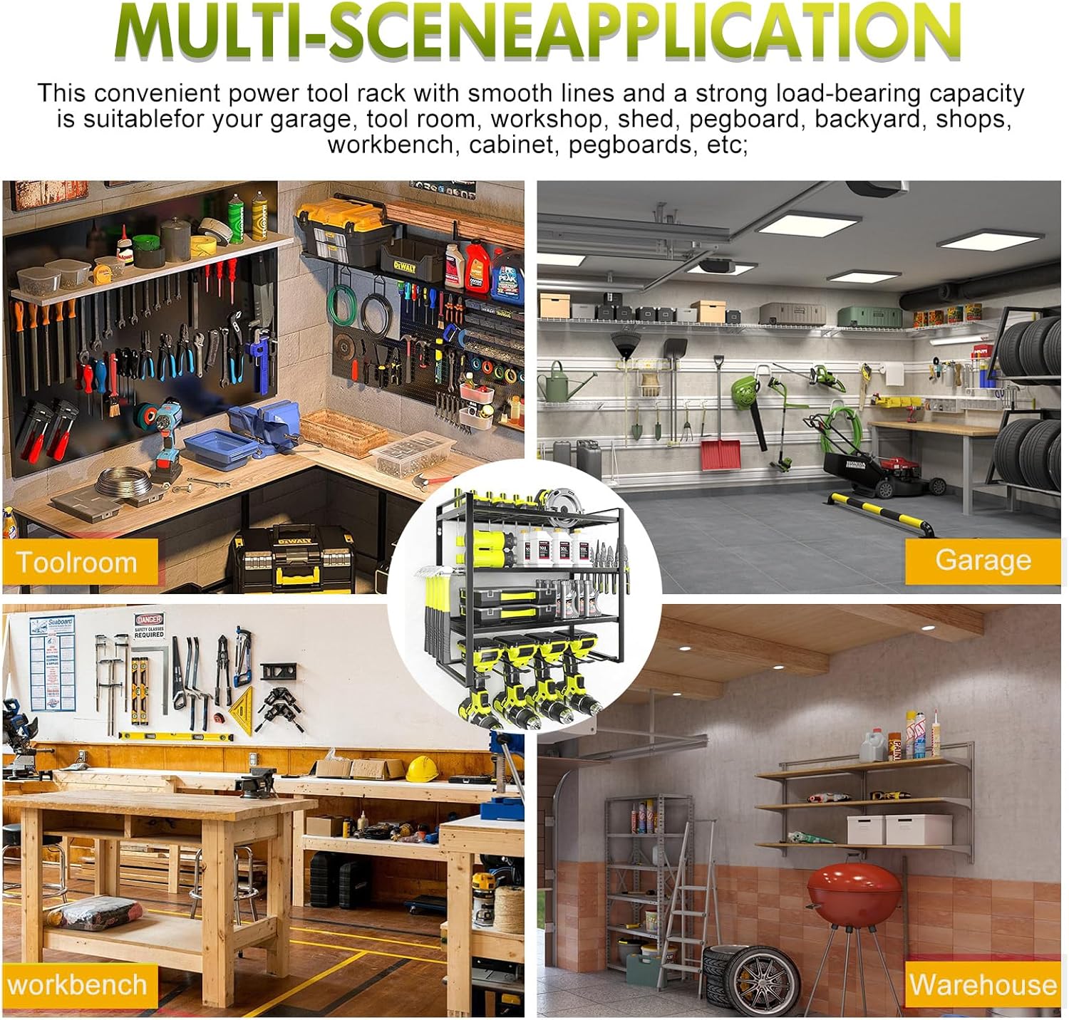- [Multi-scene Application] - This convenient power tool rack with smooth lines and a strong load-bearing capacity is suitable for your garage, tool room, workshop, shed, pegboard, backyard, shops, workbench, cabinet, pegboards, etc; Our wall-mount drill organizer would also make an excellent gift for any household hobbyist or even a hard-core craftsman