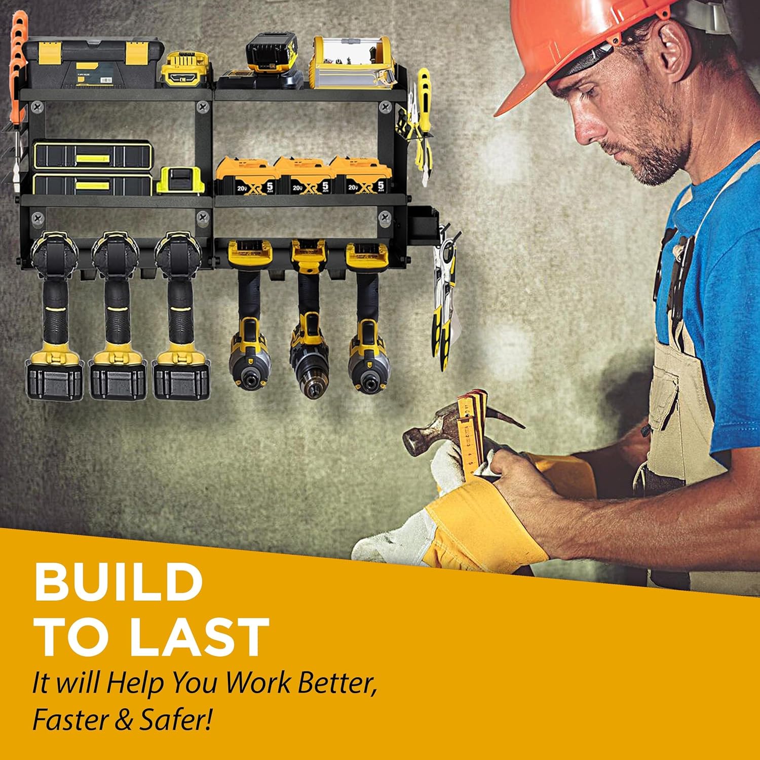 GRG Tools Heavy-Duty Power Tool Organizer – Wall Mounted Drill Rack for 6 Cordless Drills, Garage & Workshop Tool Storage Shelf with Screws & Bolts Side Box, 300LBS Load Capacity, Sturdy Metal Design