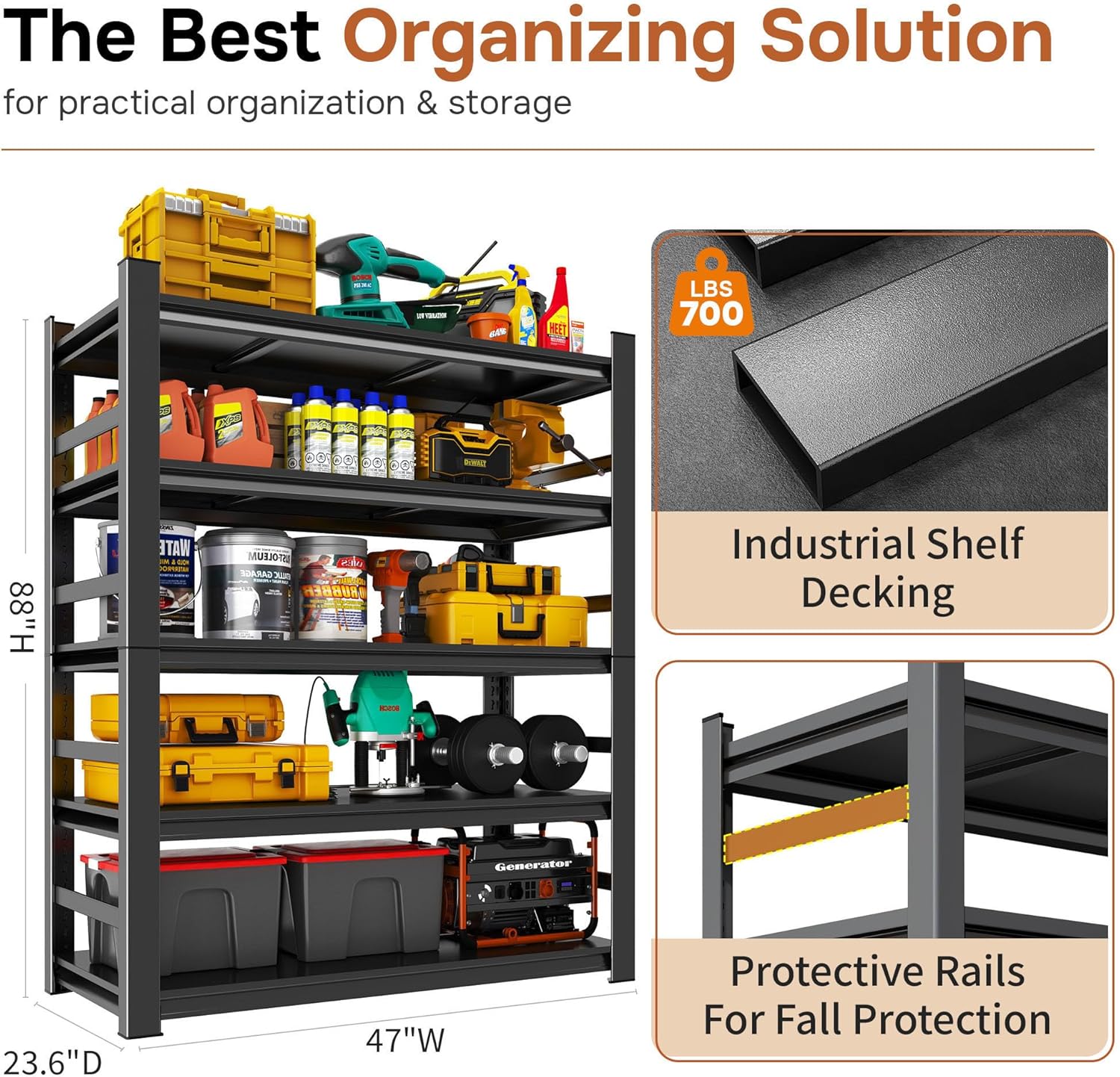 - 💪 COMMERCIAL-GRADE STRENGTH, 3500 LBS BEAST MODE – Don't settle for flimsy shelves. Our garage shelving is forged from high-quality, thickened cold-rolled steel and features an exclusive double-layered column design for unmatched stability. It effortlessly supports a massive 3500 LBS total capacity (700 LBS per shelf). From heavy power tools and packed totes to engine parts, store your heaviest items with absolute peace of mind. Conquer your clutter with confidence!
