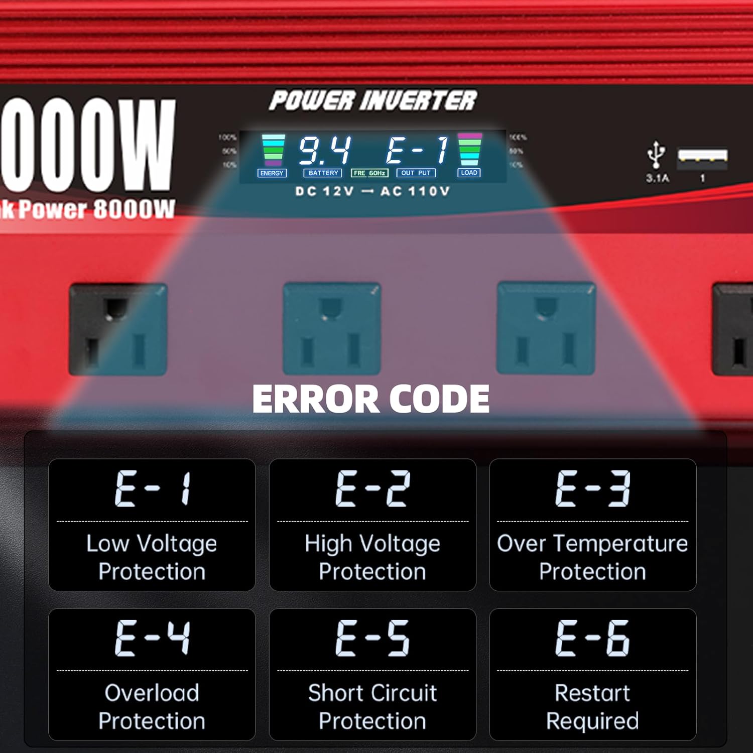 - POWERFUL OUTPUT: Convert power of DC 12V to AC 110V/120V 60Hz. Provides 4000 Watts continuous modified sine wave power and 8000 Watts surge power. Featuring 5 AC outlets and 4 USB ports for multi-purpose charging. Great High efficiency: conversion efficiency > 90%. The rated output power of this device is 4000W, it could definitely be realized in reality.