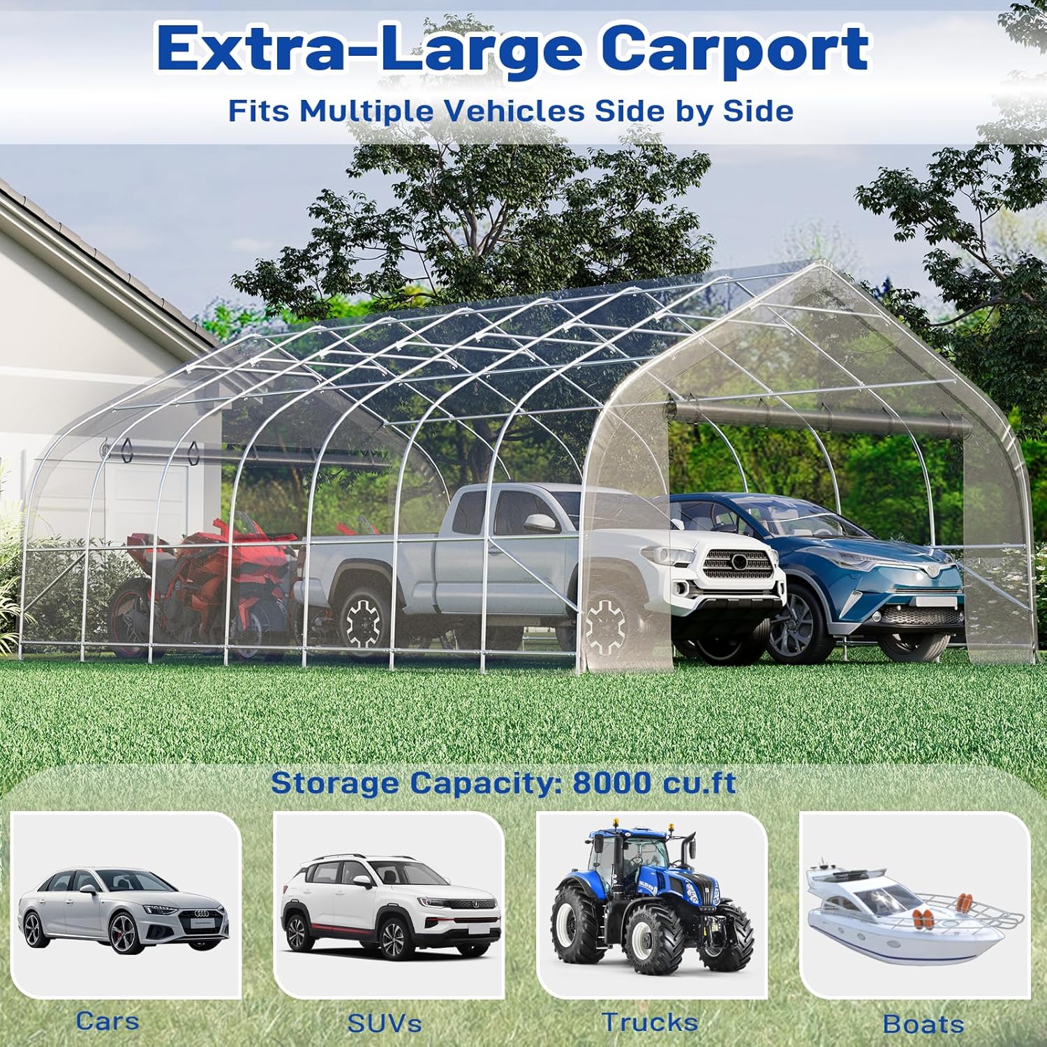 - [Double Carport]: This 20x30ft (6.1×9.1m) portable arched carport canopy is engineered for dual-vehicle parking, easily accommodating SUVs, pickup trucks, farm tractors, or small watercraft. With its heavy-duty steel frame + UV-resistant tarp, it perfectly solves garage space shortages and outdoor equipment storage challenges