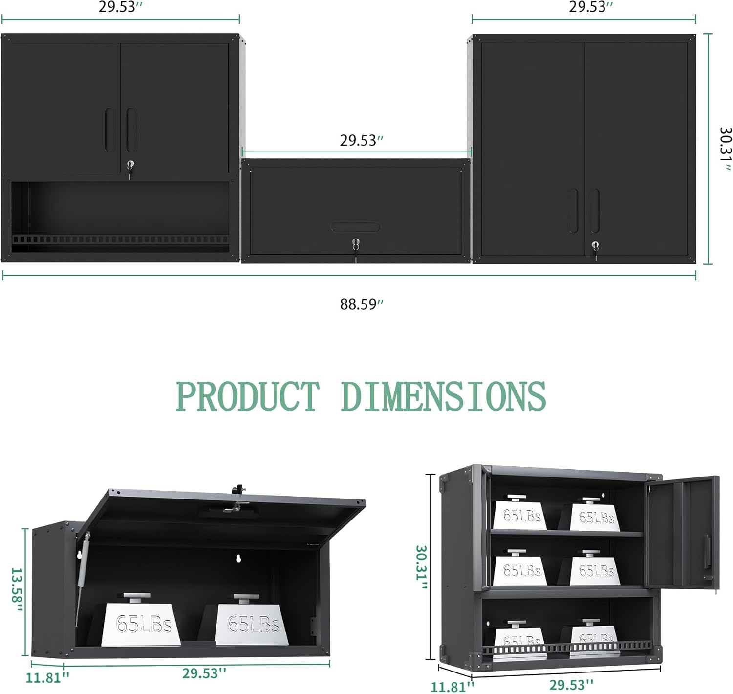 Metal Tool Cabinet,Garage Storage Cabinet System,Wall Cabinet & Locking Rolling Tool Cabinet with Doors and Adjustable Shelves,Steel Tool Cabinets for Home,Office (3 Pcs-StyleA, Black)