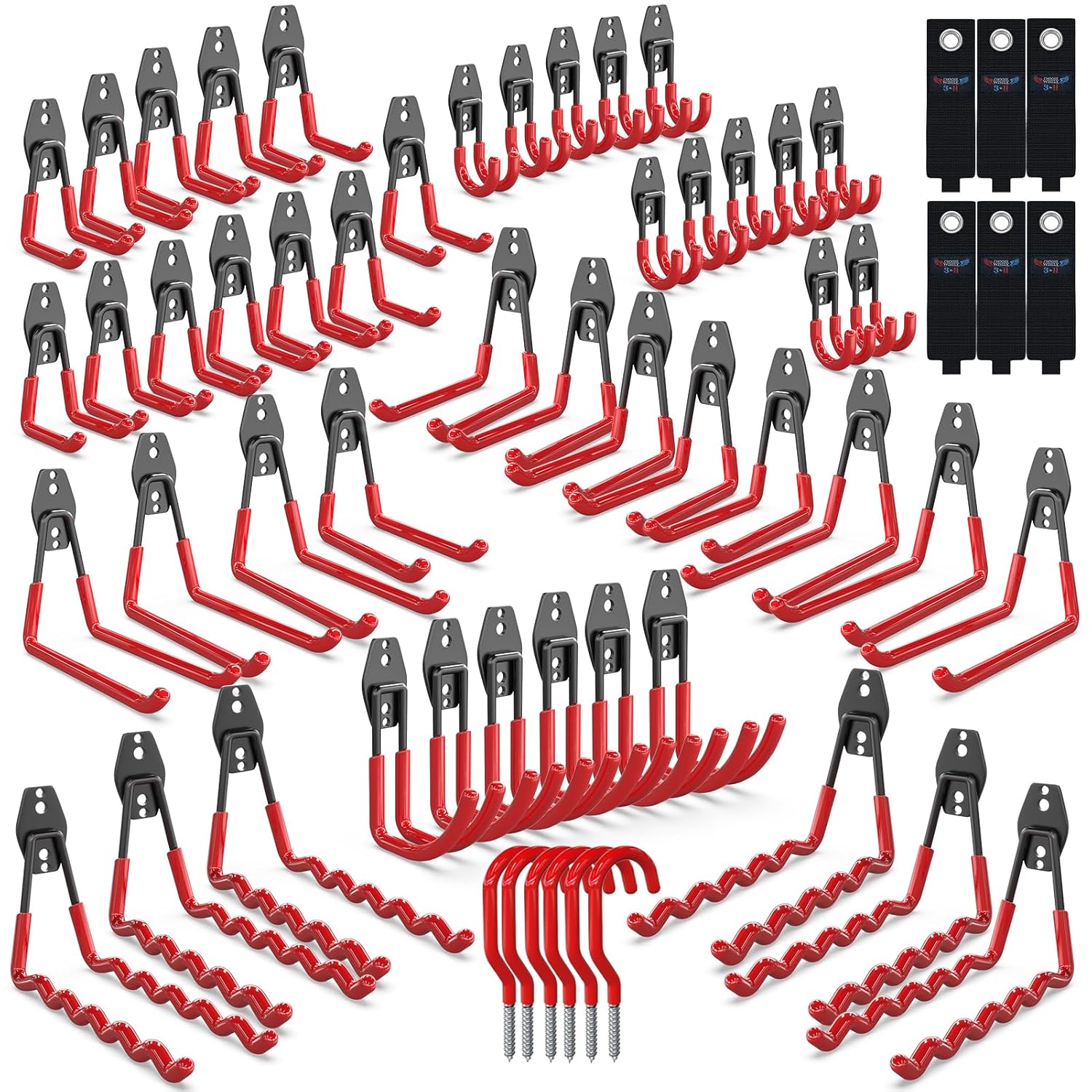 3-H Garage Wall Hooks 60 Pack, Heavy Duty Garage Hooks with Extra Welding Spots, Wall Mount Storage Organizer for Hanging Garden Lawn Tools, Ladder, Bike, WeedEater, Chair, Shovel, Blower (Red)