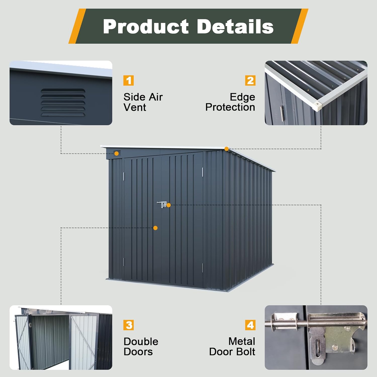 - Reinforced Lockable Doors for Peace of Mind: Designed with reinforced double doors, smooth hinges, and a padlock-ready latch, this back yard shed storage provides reliable security for garden tools, outdoor equipment, and seasonal gear.