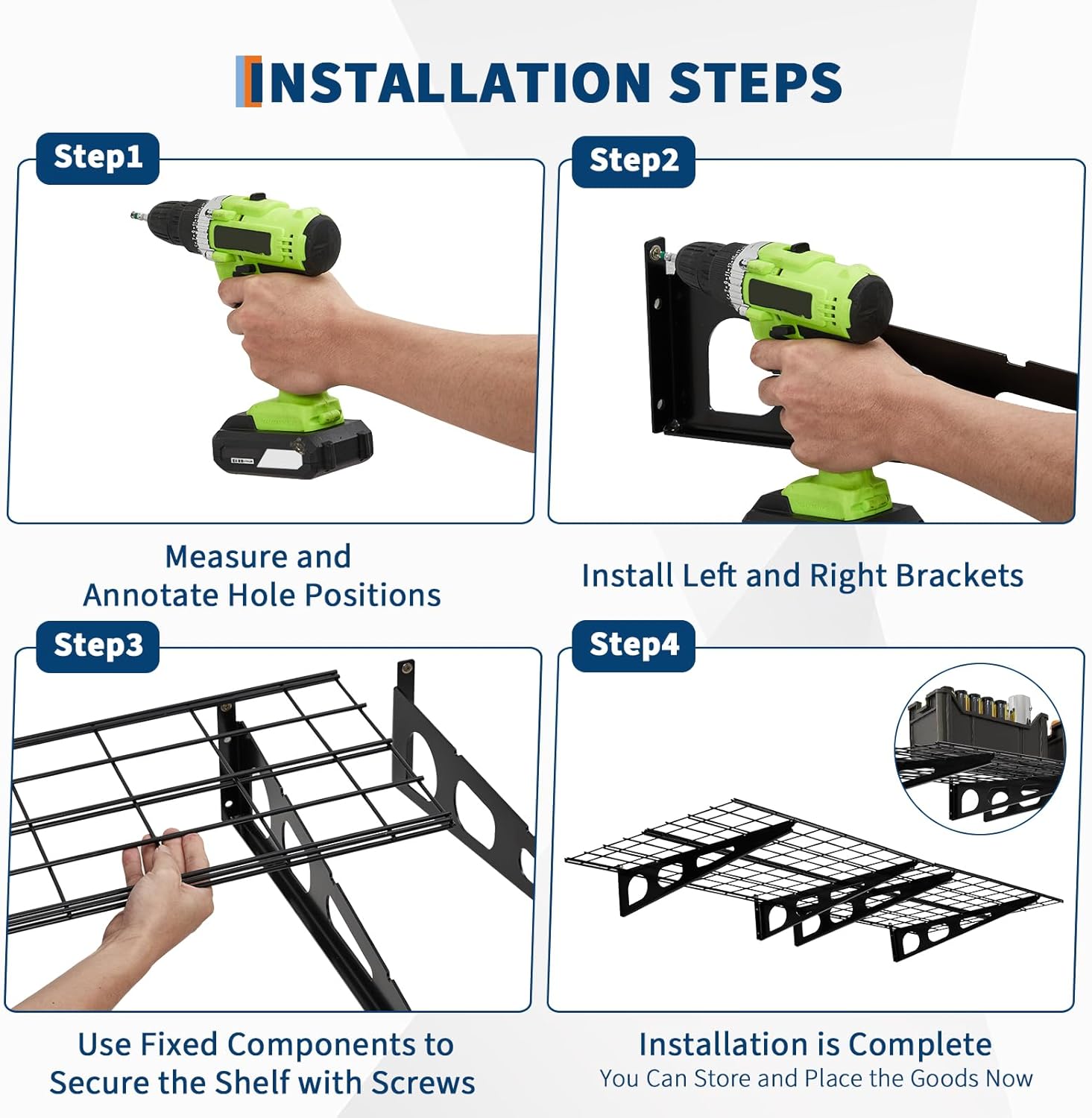 - 1,600 lbs load bearing: The garage storage shelf measures 72.05 x 24.8 x 12.01 inches (W x D x H) with a 0.5 foot arc height. Heavy-duty powder-coated steel garage storage racks are set to provide high-quality hardware for each component. It depends on the load bearing capacity of the wall and the installation environment. The maximum load is 800 pounds per piece, and if mounted on a wall post, measure the distance before buying.