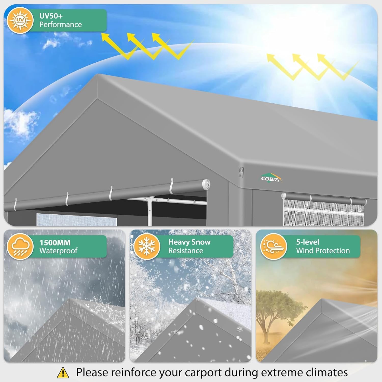 - 【Sturdy Structure】 Our heavy duty carport features 1.5-inch steel pipes with premium powder coating finish (more durable than galvanized), ensuring superior structural stability and enhanced rust/corrosion resistance. Equipped with large ground nails, wind ropes, and built-in sandbags for maximum stability.