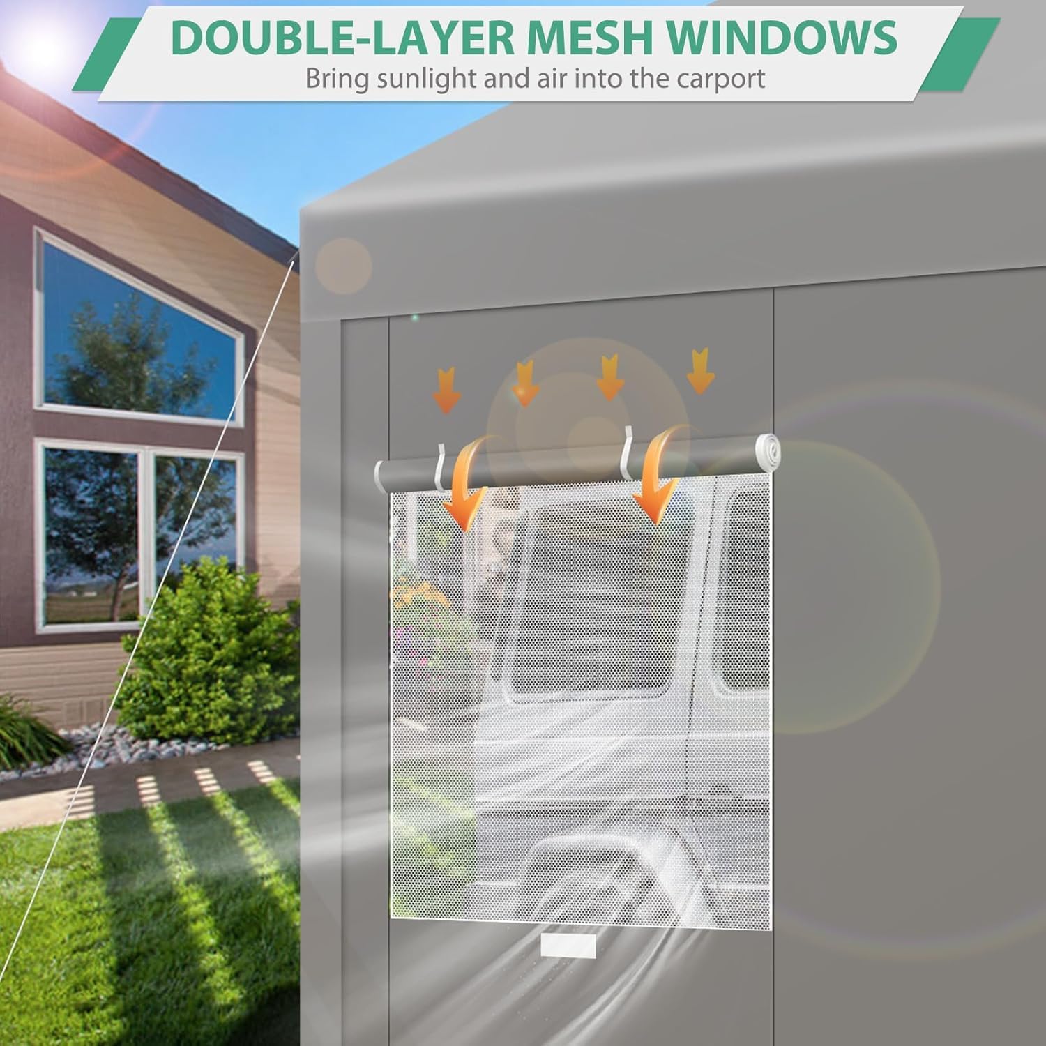 - 【Good Ventilation】 Our portable garage is equipped with four roller shutter mesh windows and two zippered doors on two side walls, which enhance airflow, reduce moisture accumulation, and create a comfortable internal environment.