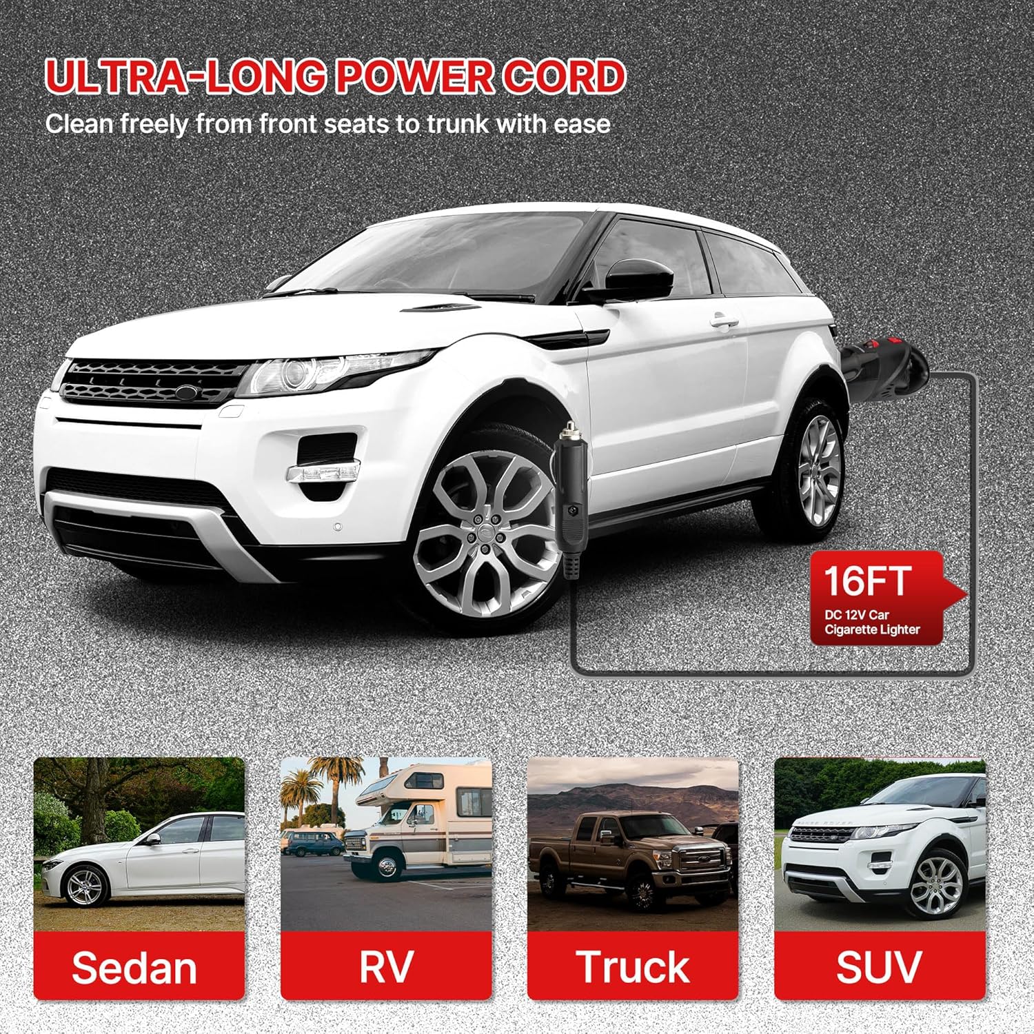 - Easy Plug & Go: Simply plug into your carβs 12V cigarette lighter socket and start cleaning instantly. The 16ft extra-long power cord reaches every corner of your vehicle, from trunk to dashboard, without unplugging.