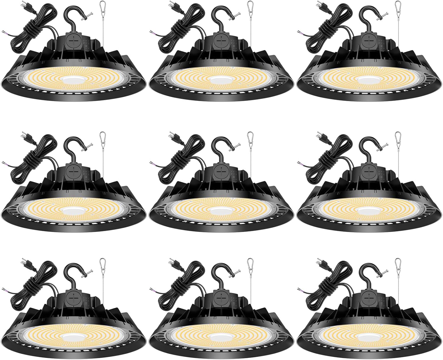 9Pack LED High Bay Lights, 300W UFO High Bay LED Shop Lights, 45000LM Adjustable CCT(5700K 5000K 4500K) & Power(300W 240W 200W), 0-10V Dimmable, 5' Cable Plug, IP65 Waterproof, ETL & DLC Listed