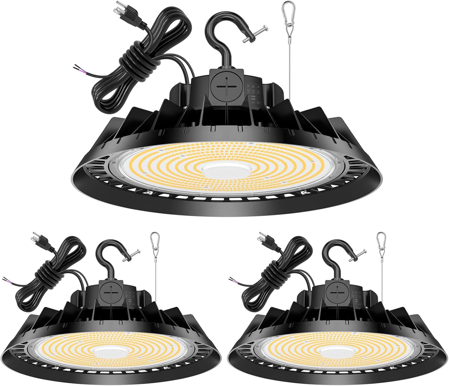 3Pack LED High Bay Lights, 240W UFO High Bay LED Shop Lights, 36000LM Adjustable CCT(5700K 5000K 4500K) & Power(240W 200W 150W), 0-10V Dimmable, 5' Cable Plug, IP65 Waterproof, ETL & DLC Listed