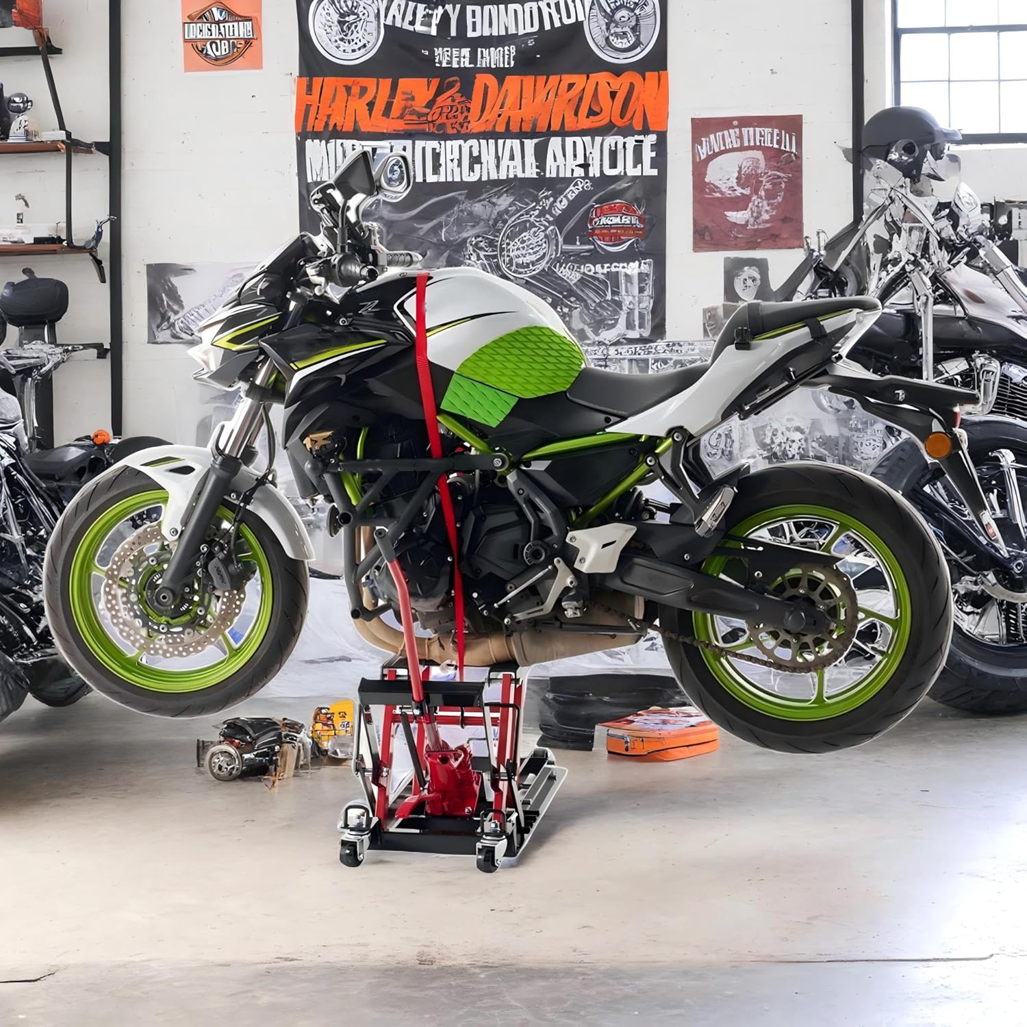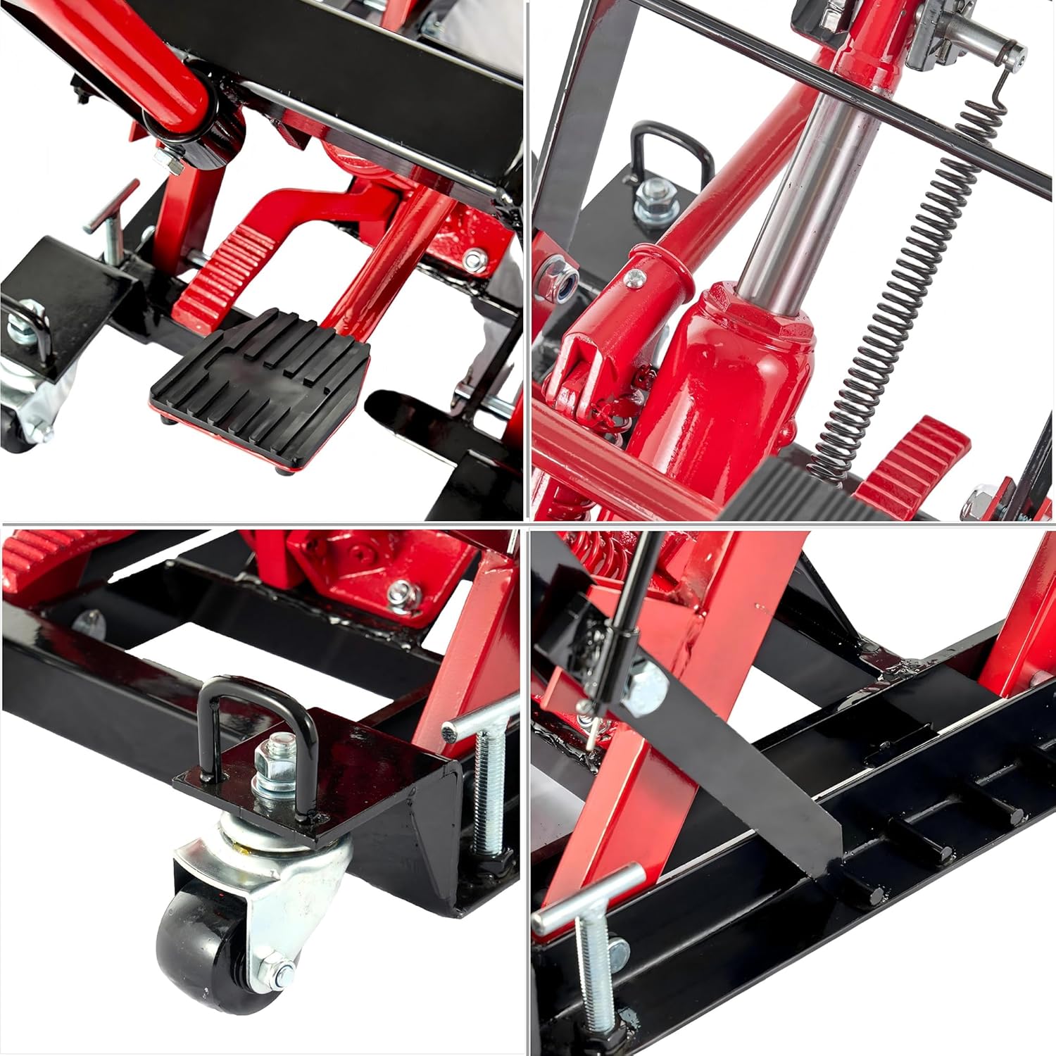 - Complete Lift Kit Included: Comes with two tie-down straps, two adapter bars, detachable handle, and a foot pedal for controlled hydraulic lifting—ideal for garages, workshops, and home vehicle maintenance. (Not suitable for motorcycles with bottom shells)