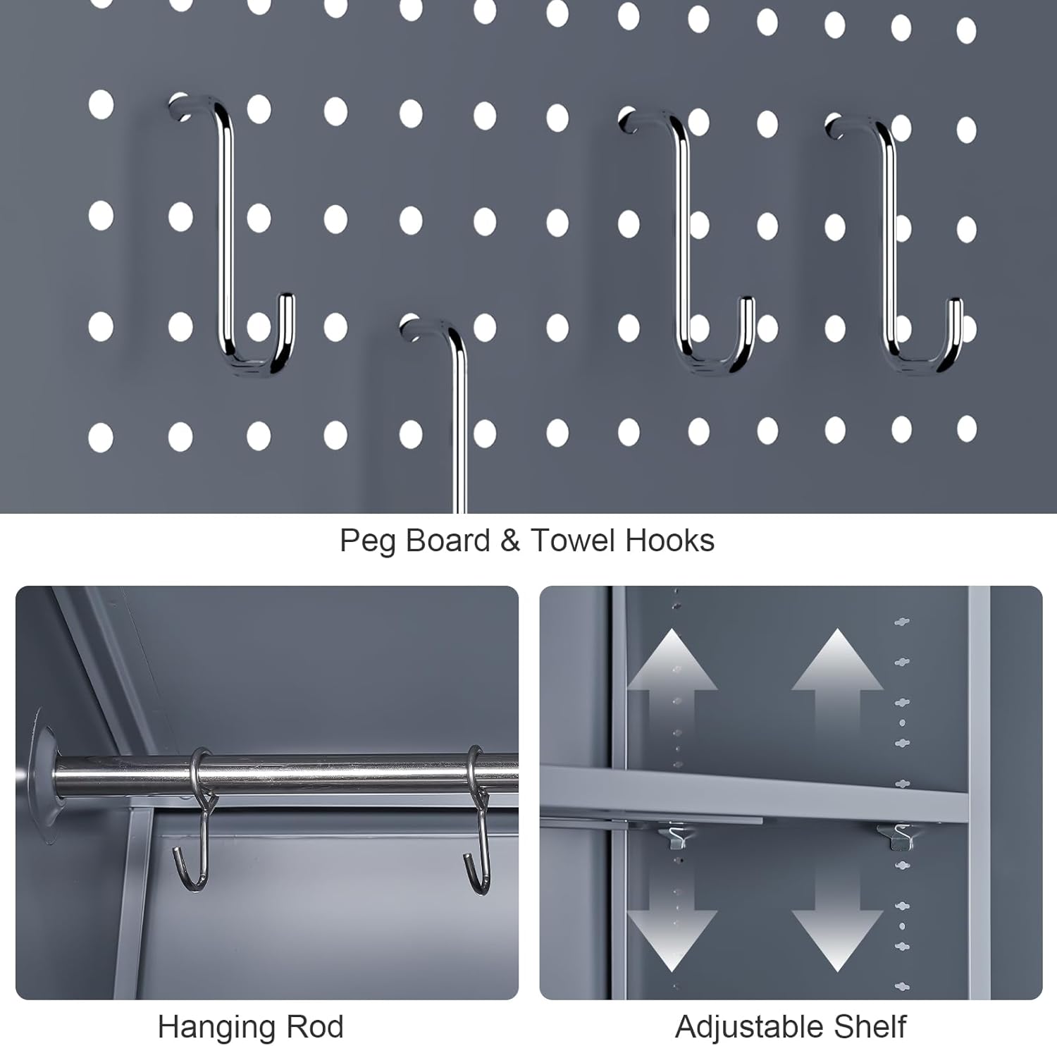 - 【Versatile Use】This cleaning metal storage cabinet comes with multiple accessories to meet your needs. Adjustable shelves accommodate items of varying heights. The right side is equipped with a hanging rod and S-hooks, and the hanging rod on the door can be used for towels and other items. The perforated panel design makes it easy to store and retrieve tools, keeping the space tidy and organized. The cabinet can store documents, brooms, mops, tools, towels, clothes, and more.