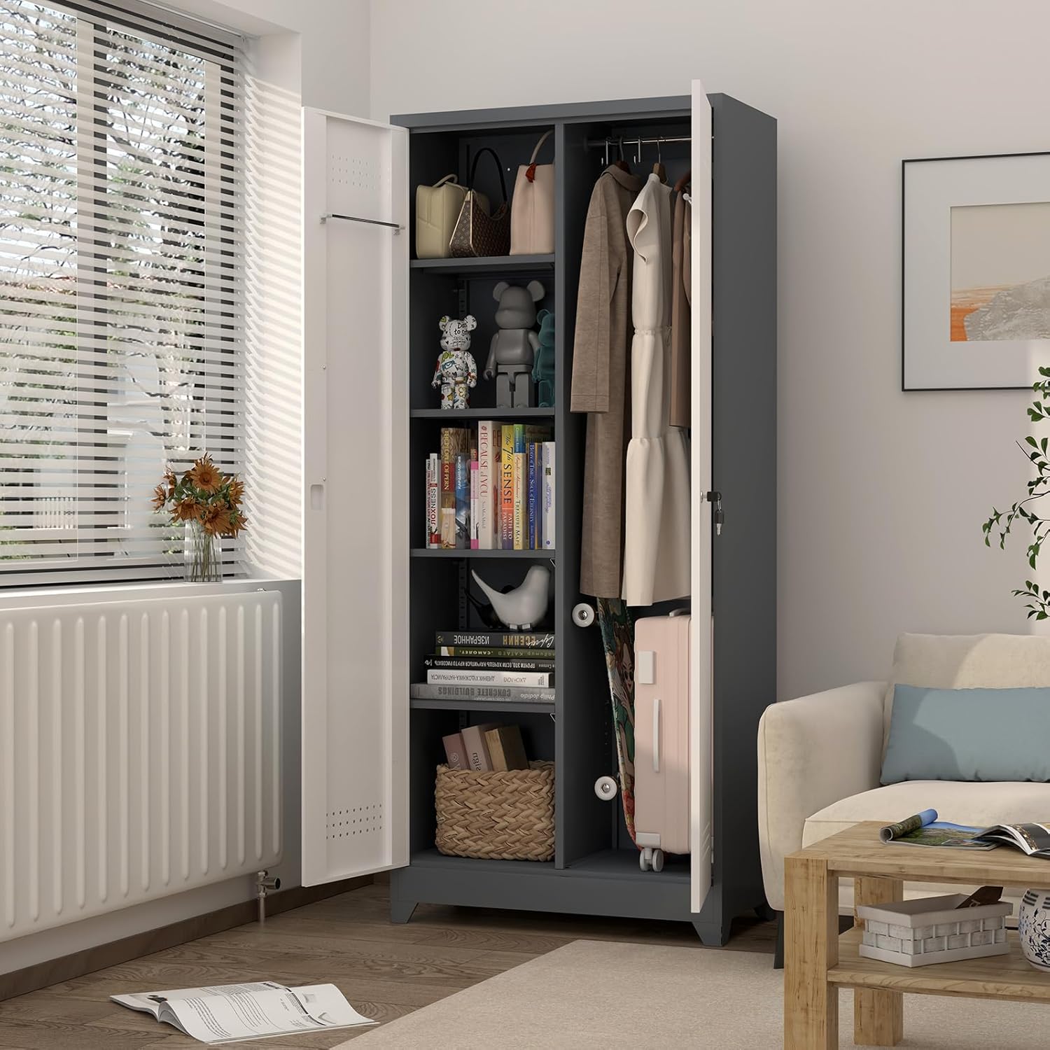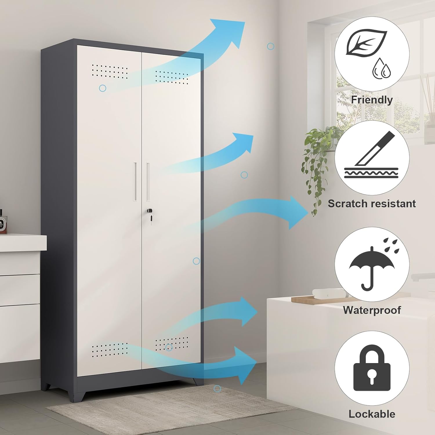 - 【User-Friendly Design】The bottom of the broom metal cabinets with locking doors and adjustable Shelves is made of stainless steel, which is corrosion-resistant and easy to clean. The ventilation holes on the panel prevent moisture and allow breathability, keeping the interior dry and reducing odors. The four standing feet enhance the stability of the cabinet and make it easier to clean underneath.