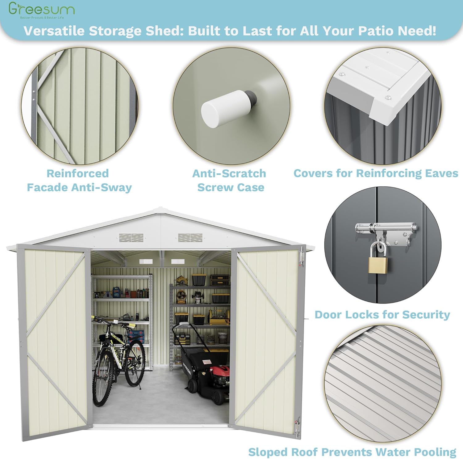 Greesum 8×10FT Outdoor Storage Shed, Metal Patio Storaged Sheds with Lockable Doors, Sheds & Outdoor Storage for Bike, Backyard, Pool and Garden, Gray