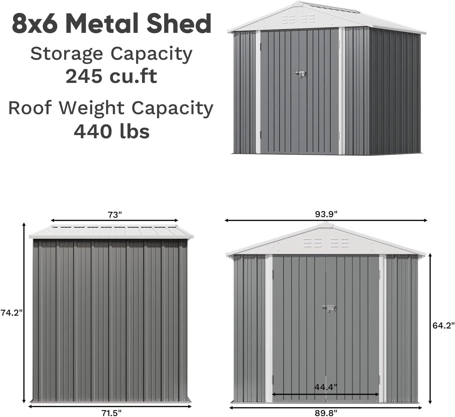 Greesum 8×6FT Outdoor Storage Shed, Metal Patio Storaged Sheds with Lockable Doors, Sheds & Outdoor Storage for Bike, Backyard, Pool and Garden, Gray