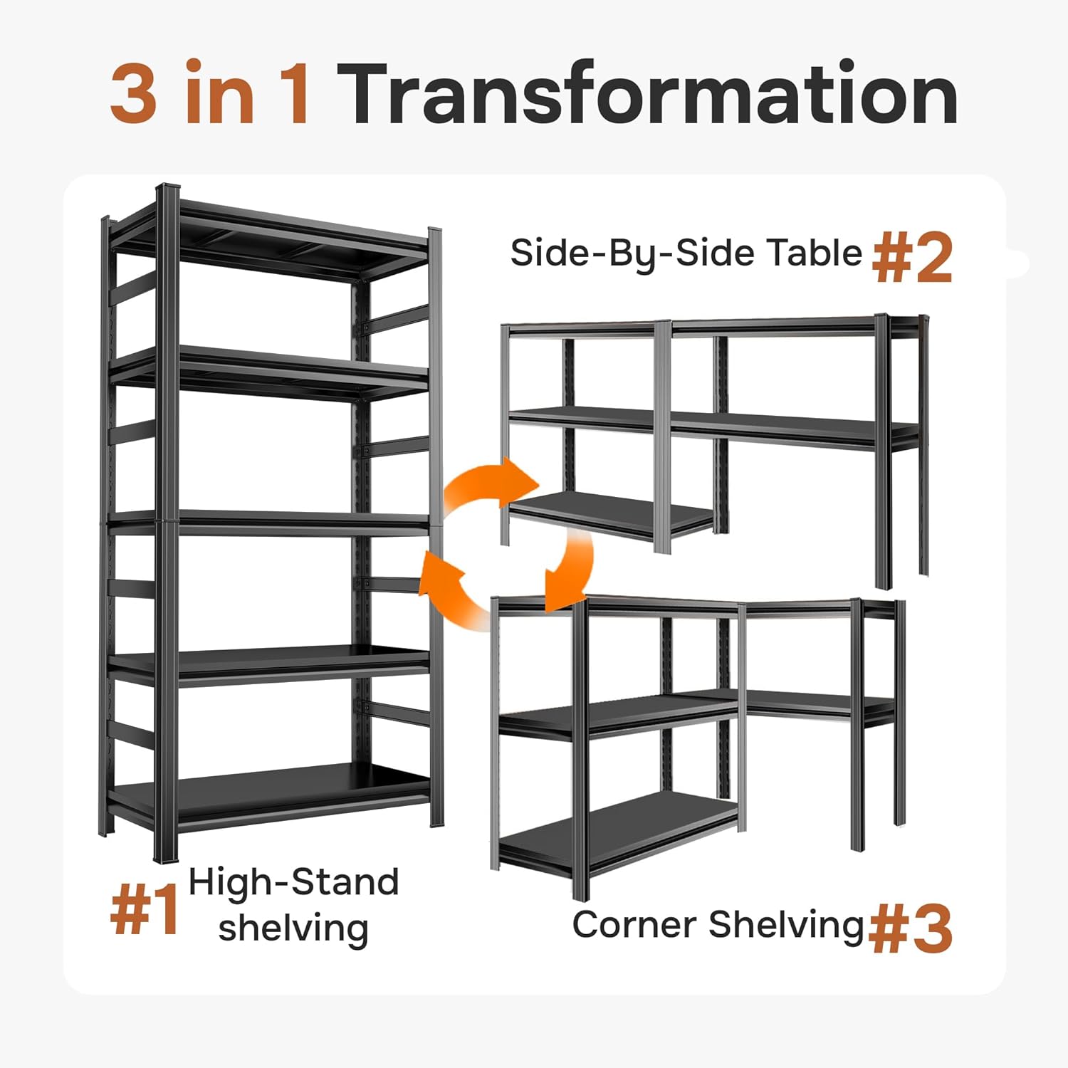 - 💪 COMMERCIAL-GRADE STRENGTH, 3500 LBS BEAST MODE – Don't settle for flimsy shelves. Our garage shelving is forged from high-quality, thickened cold-rolled steel and features an exclusive double-layered column design for unmatched stability. It effortlessly supports a massive 3500 LBS total capacity (700 LBS per shelf). From heavy power tools and packed totes to engine parts, store your heaviest items with absolute peace of mind. Conquer your clutter with confidence!