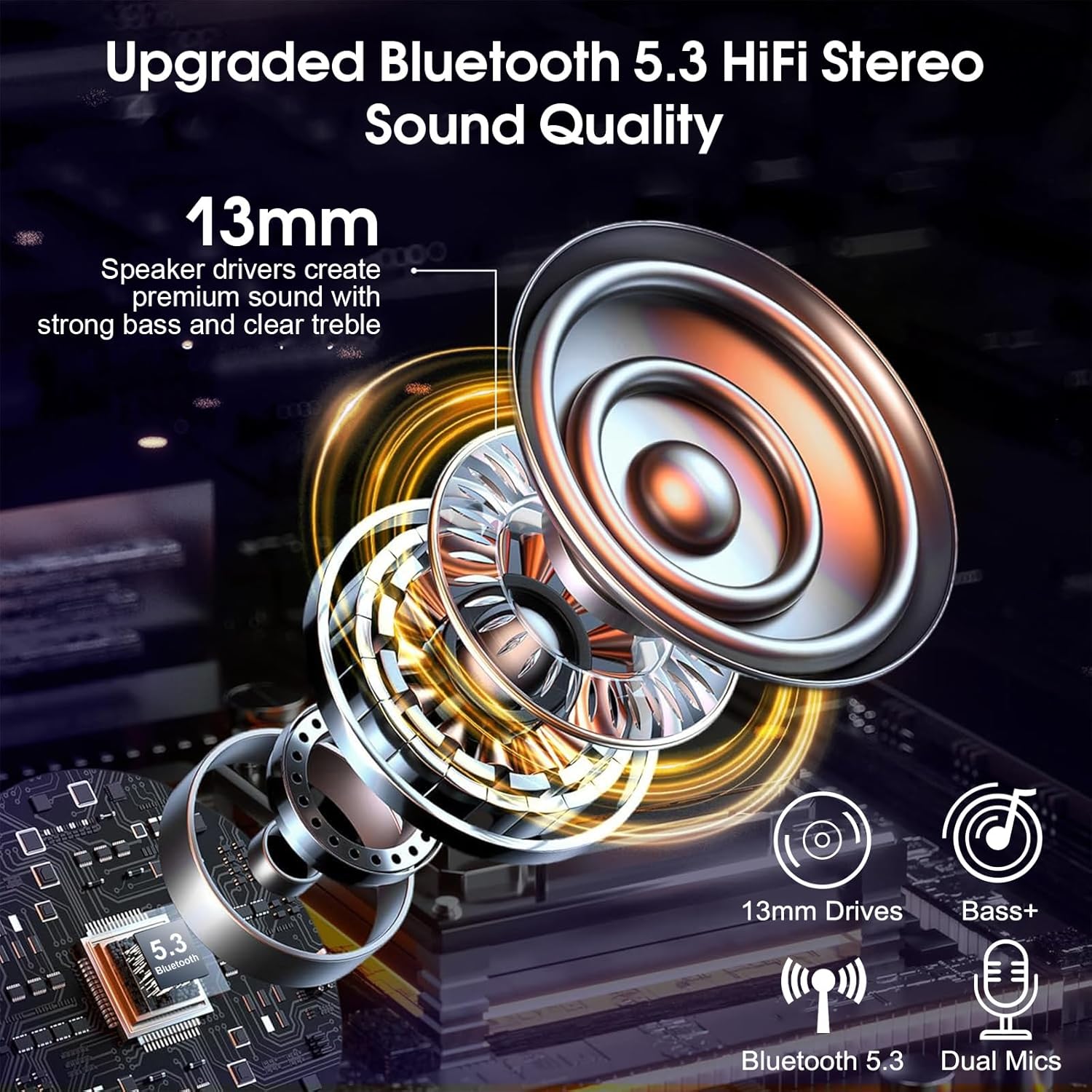 - Bluetooth 5.3 and Fast Pairing: The wireless headset are equipped with a Bluetooth 5.3 chip. Compared with Bluetooth 5.2, it not only provides a faster and more stable connection, but also maximizes low power consumption. Whether you're on a high-speed train or in a noisy airport lobby, you'll be guaranteed a smooth call and music experience. When you take the wireless earpiece out of the charging box, it will automatically turn on and activate the search and connection functions of your phone.