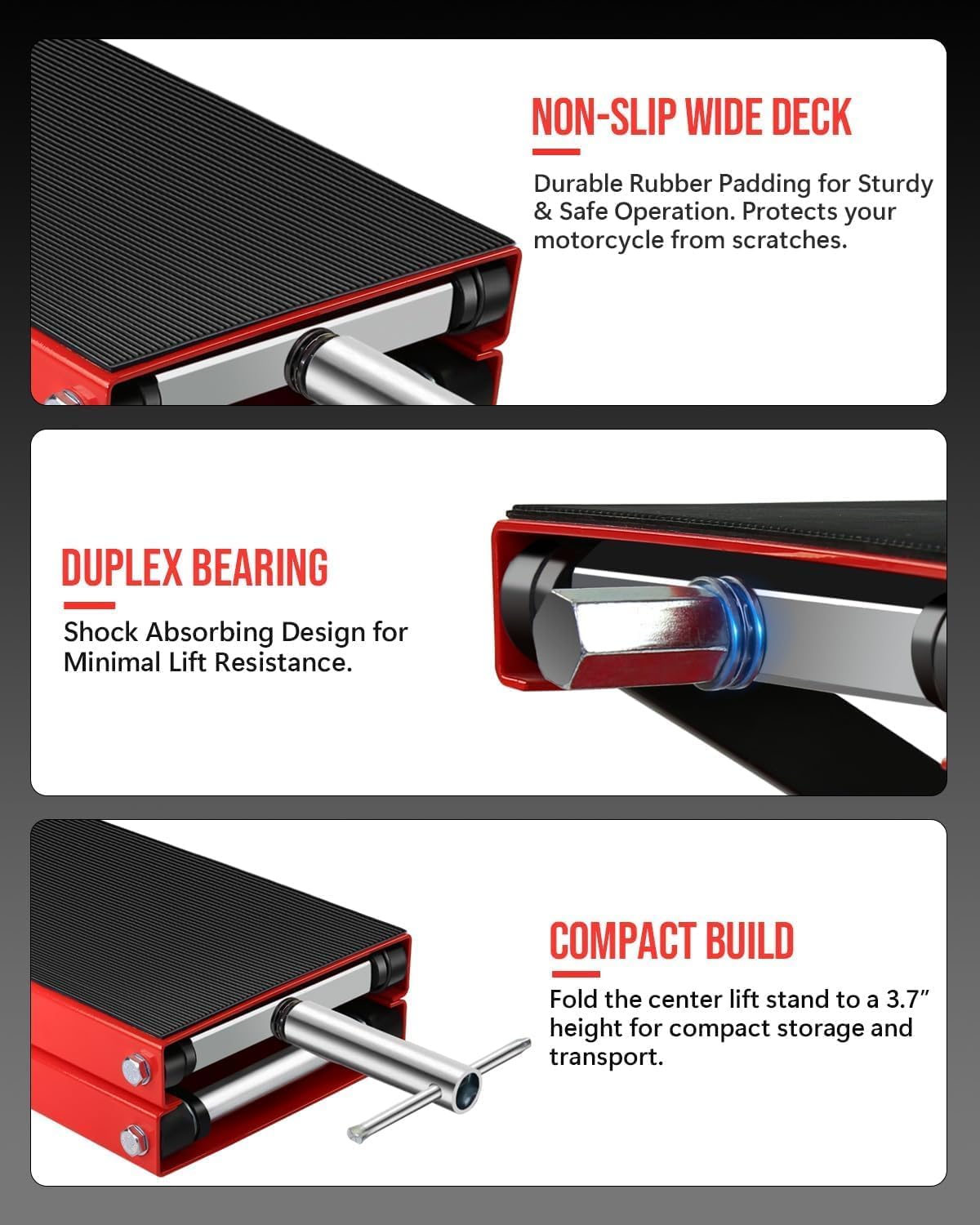 - Secure Heavy-Duty Motorcycle Stand :Engineered with a steel-reinforced frame, this motorcycle lift stand provides exceptional stability for cruisers, touring bikes, and off-road motorcycles. The extra-wide platform with non-slip rubber padding prevents scratches and slips, serving as reliable jack stands during tire changes or chain maintenance.