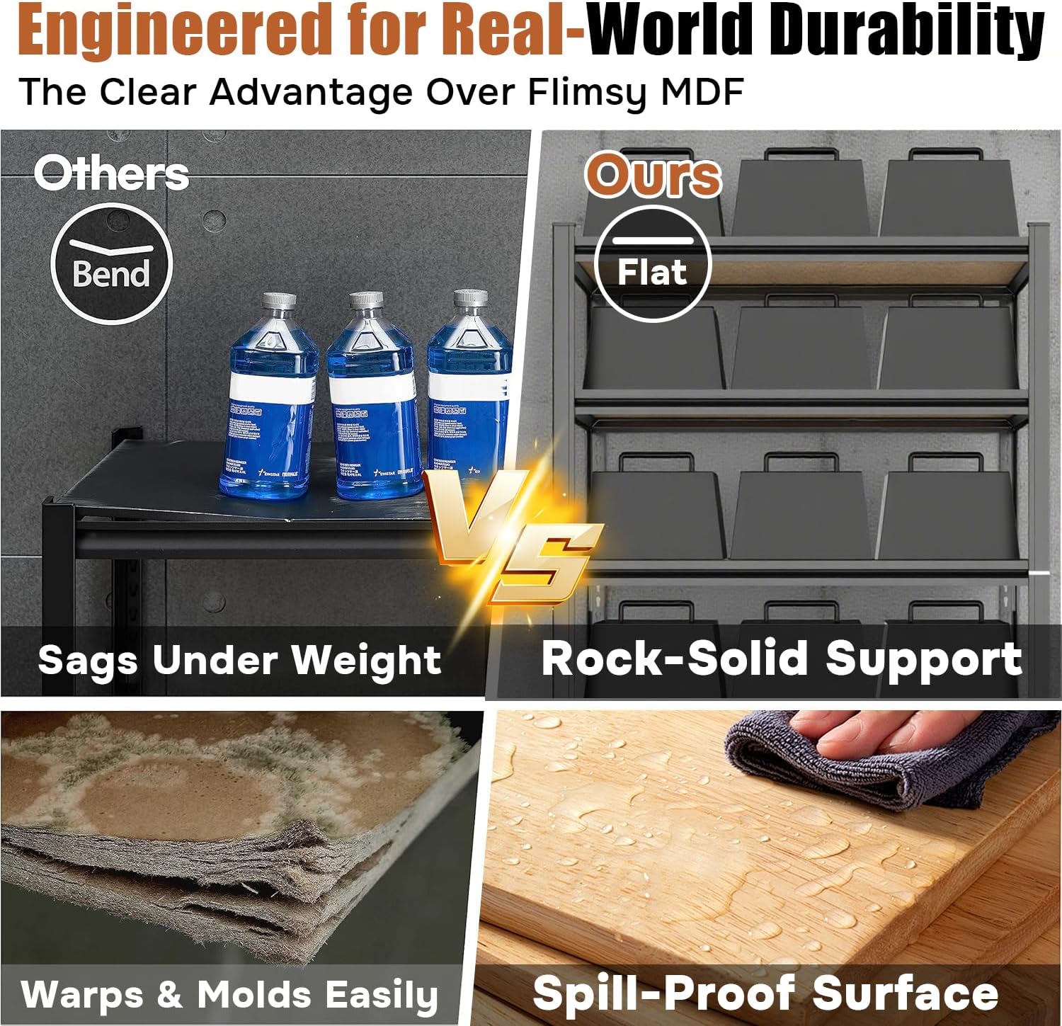 - 🔧 FULLY CUSTOMIZABLE TO FIT YOUR GEAR – Your storage, your rules. Every single shelf is fully height-adjustable, giving you the freedom to create the perfect storage solution. Make room for tall shop vacs, bulky storage bins, or small parts organizers with ease. This isn't just a shelf; it's a custom-fit system designed to adapt perfectly to your items, big or small.