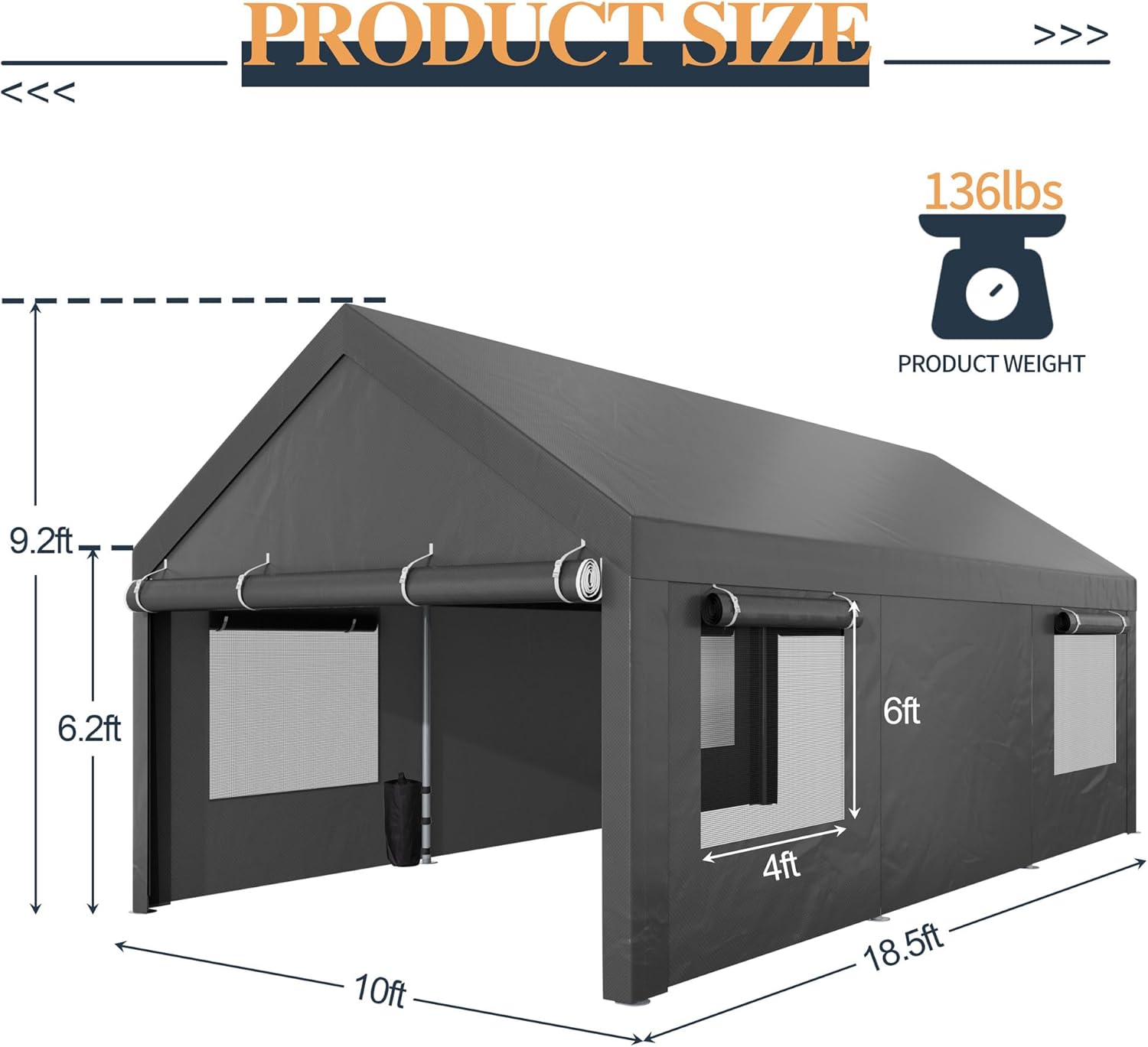 - 【Larger Carport】: The 10x20 heavy duty carport provides plenty of space for your vehicles, boats, cargo, etc. Detachable side walls and doors to meet your needs. It is suitable for outdoor events like parties, weddings, commercial fairs.