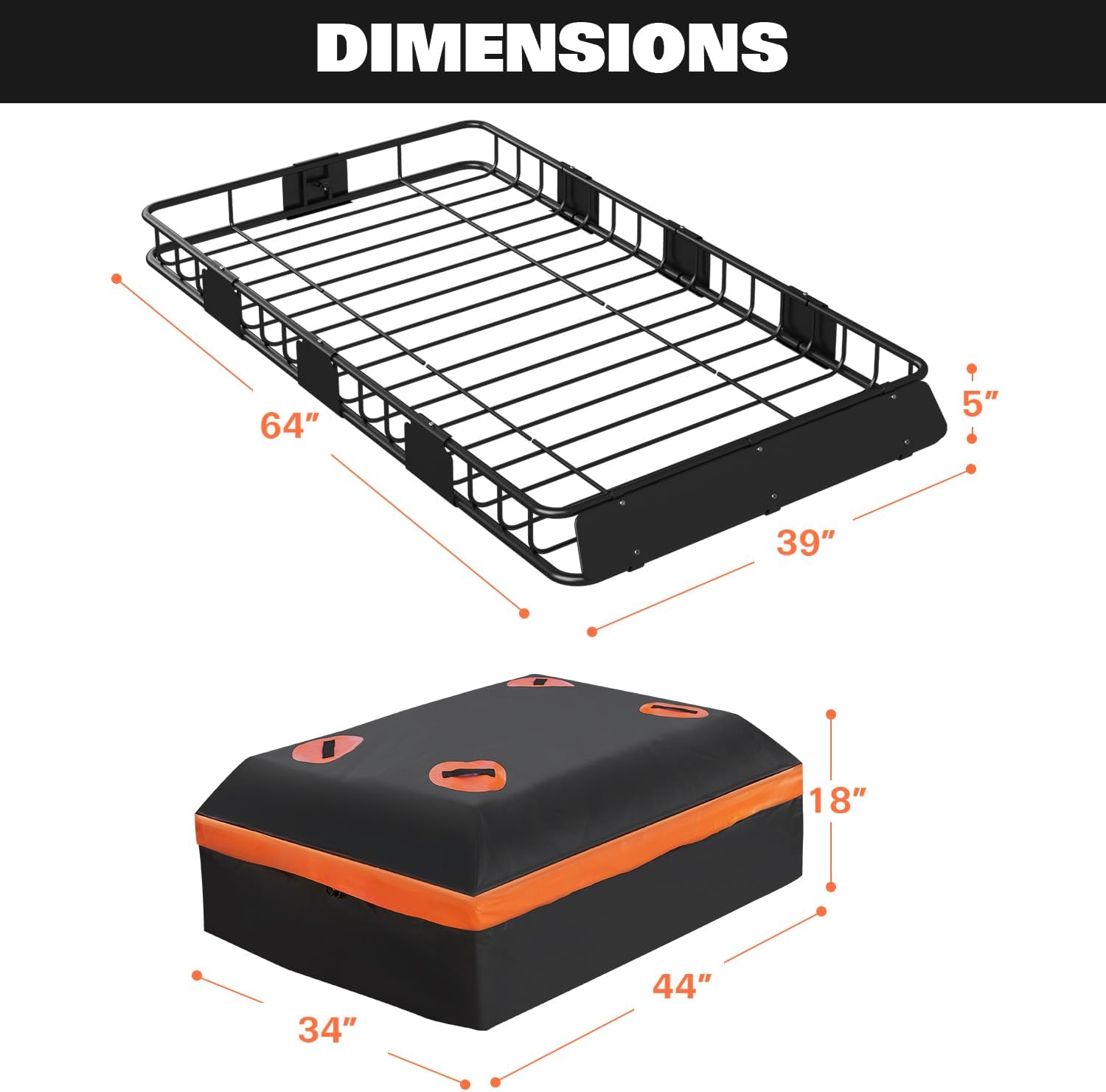 - Overall Dimensions: The roof rack measures 64" (L) x 39" (W) x 5" (H) when fully assembled and can be adjusted to 34.5 x 39 x 5" or 49 x 39 x 5" or 64 x 39 x 5" to fit different vehicles, such as SUVs, MPVs, and pick-up trucks.