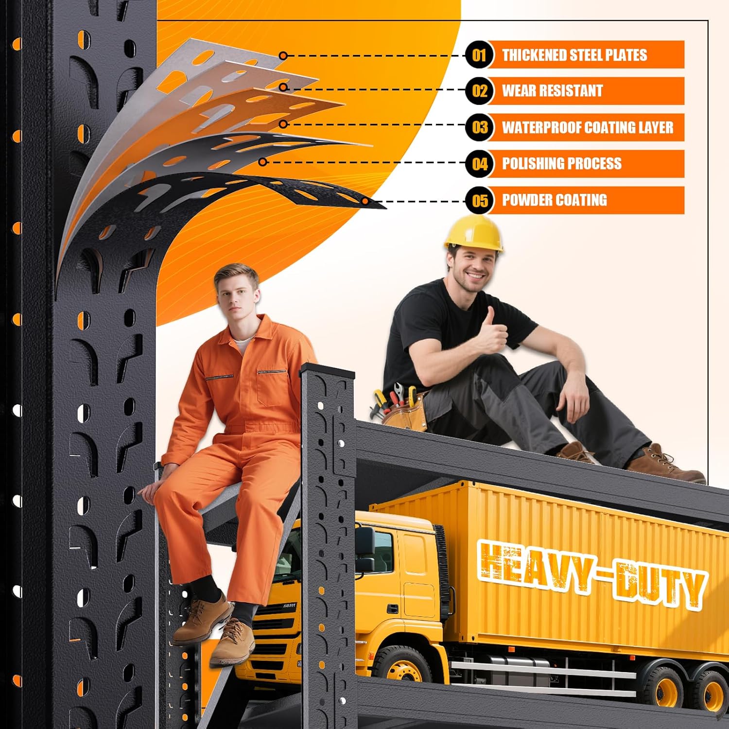 - Ultra-Stable Heavy Duty Garage Shelving: This 4-tier all-steel heavy duty shelving features a continuous upright column design with seamless connections, significantly reducing risks from loose joints. Reinforced diagonal braces distribute weight evenly, ensuring rock-solid stability even when bearing loads up to 6,000 lbs. This metal shelving provides the most solid support for your garage storage, giving you complete peace of mind