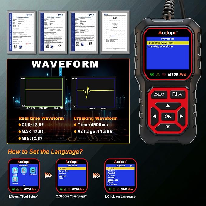 - 【Multi-Language Support Worldwide】 BT60 PRO supports 12 languages, including English, French, German, Spanish, Russian, Dutch, Finnish, and Polish, ensuring accessibility for users globally. As a professional-grade battery tester, it caters to international markets without language barriers. Additionally, its functionality as a battery tester 12v automotive makes it highly adaptable for both local and global applications, enhancing usability for technicians and DIY enthusiasts.